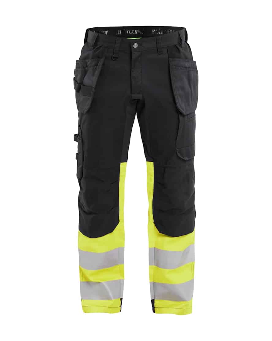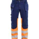 Blåkläder 1558 1811 highvis riipputaskuhousut stretch. Joustavat ja kestävät riipputaskuhousut tarkkaan mietityillä yksityiskohdilla. Stretch-kangasta on haaroissa, takapuolella polvissa liikkuvuuden parantamiseksi. CORDURA®-stretch polvisuojataskut lisäävät mukavuutta polvilla työskenneltäessä. Paljon toiminnallisia taskuja kuten puhelintasku sisäpuolella, kolmiosaiset riipputaskut, mittatasku, jossa puukonpidike ja kynätasku.