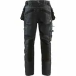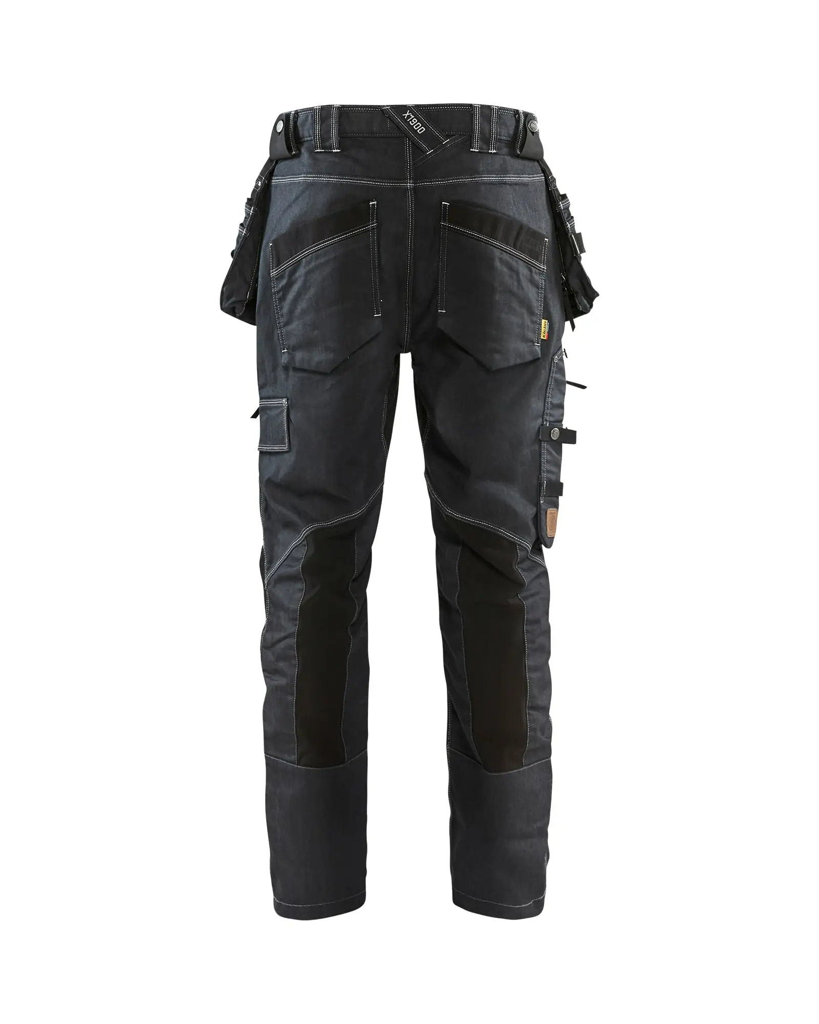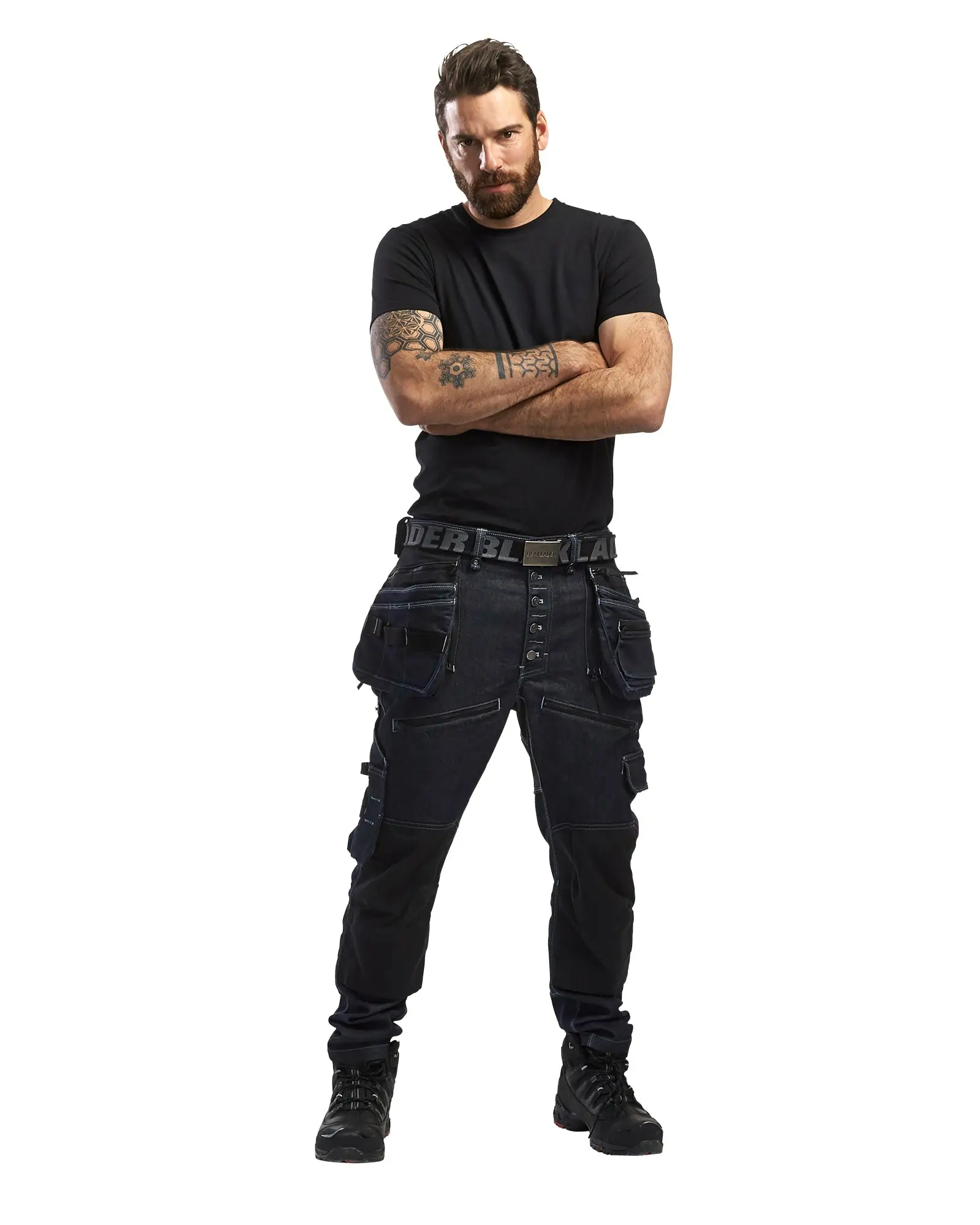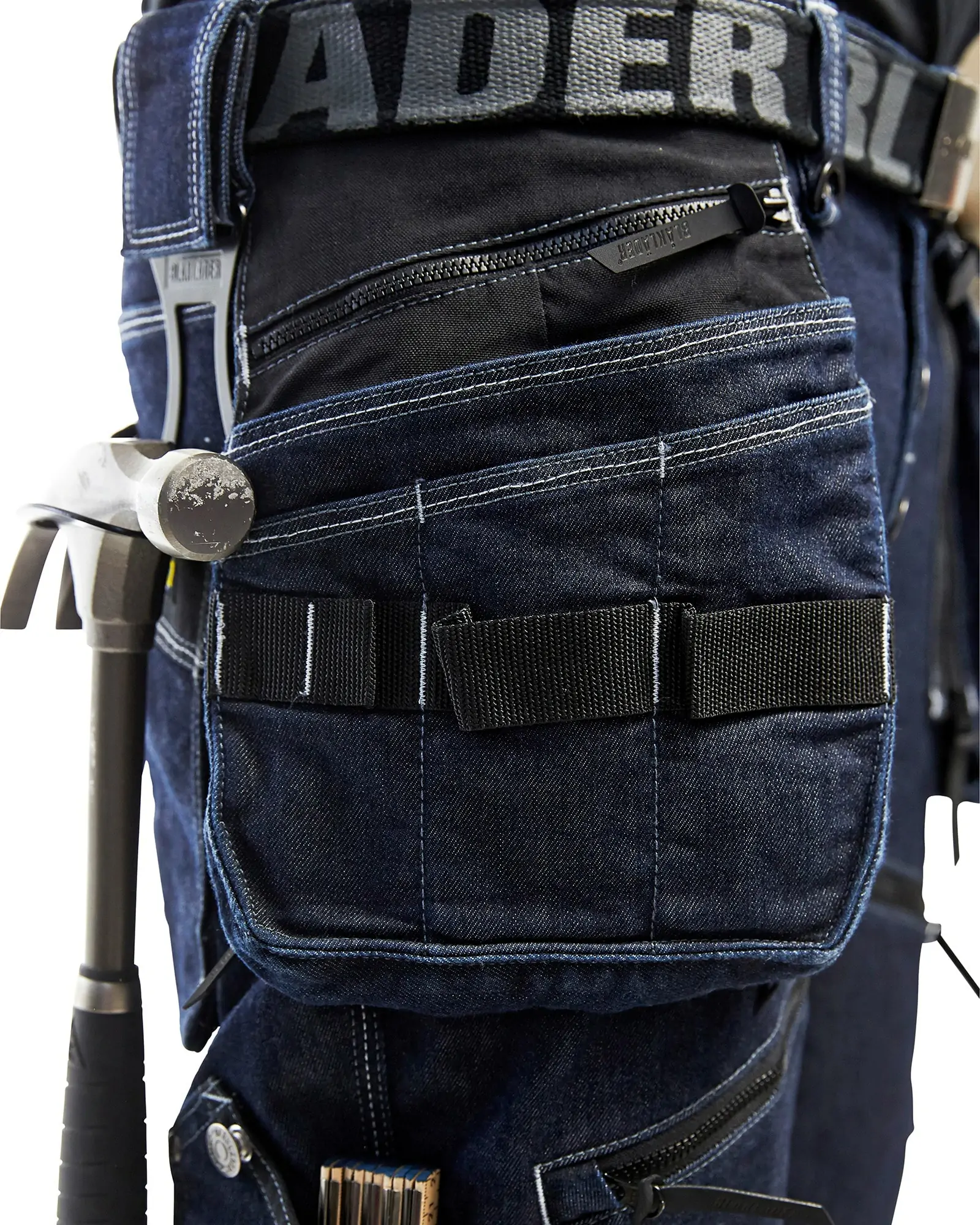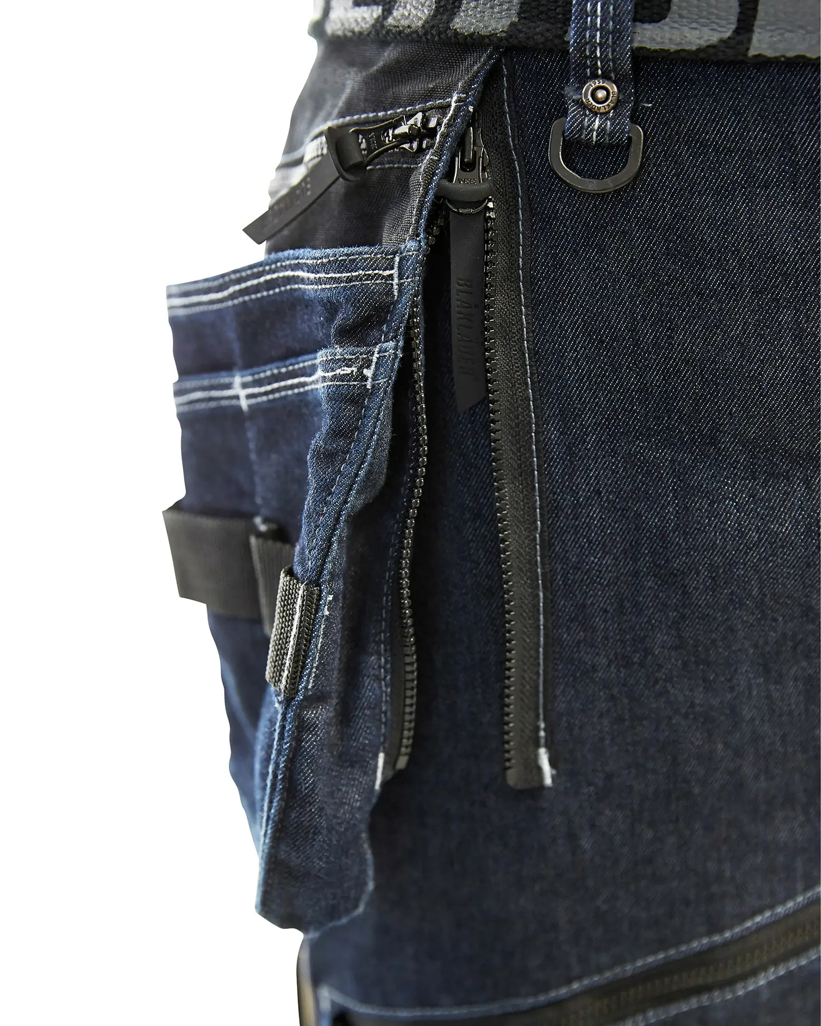 Blåkläder 1999 1141 X1900 riipputaskuhousut stretch. Kestävät riipputaskuhousut, joissa on matala haara ja kapenevat lahkeet. Housut on valmistettu Cordura® Denim kankaasta, joka on joustavaa ja mukavaa päällä. Erinomaista liikkuvuutta ja mukavuutta varten housuissa on joustavat osiot haaroissa ja pohkeissa. Polvet sekä toiminnaliset taskut on Cordura® 1000-vahvistetut. Riipputaskuissa on vetoketjut, mikä mahdollistaa niiden kiinnittämisen reiteen.