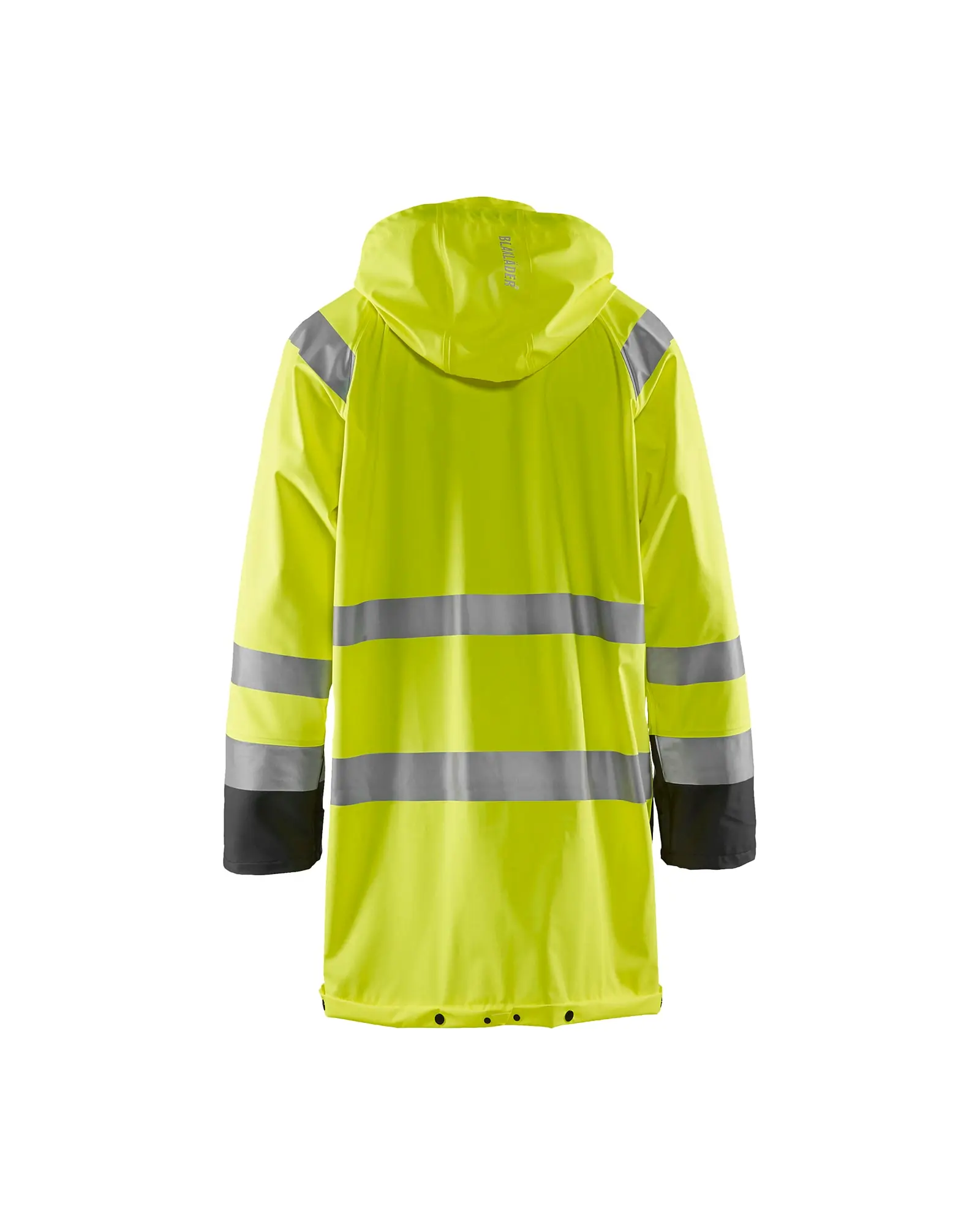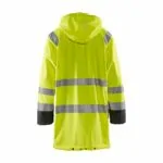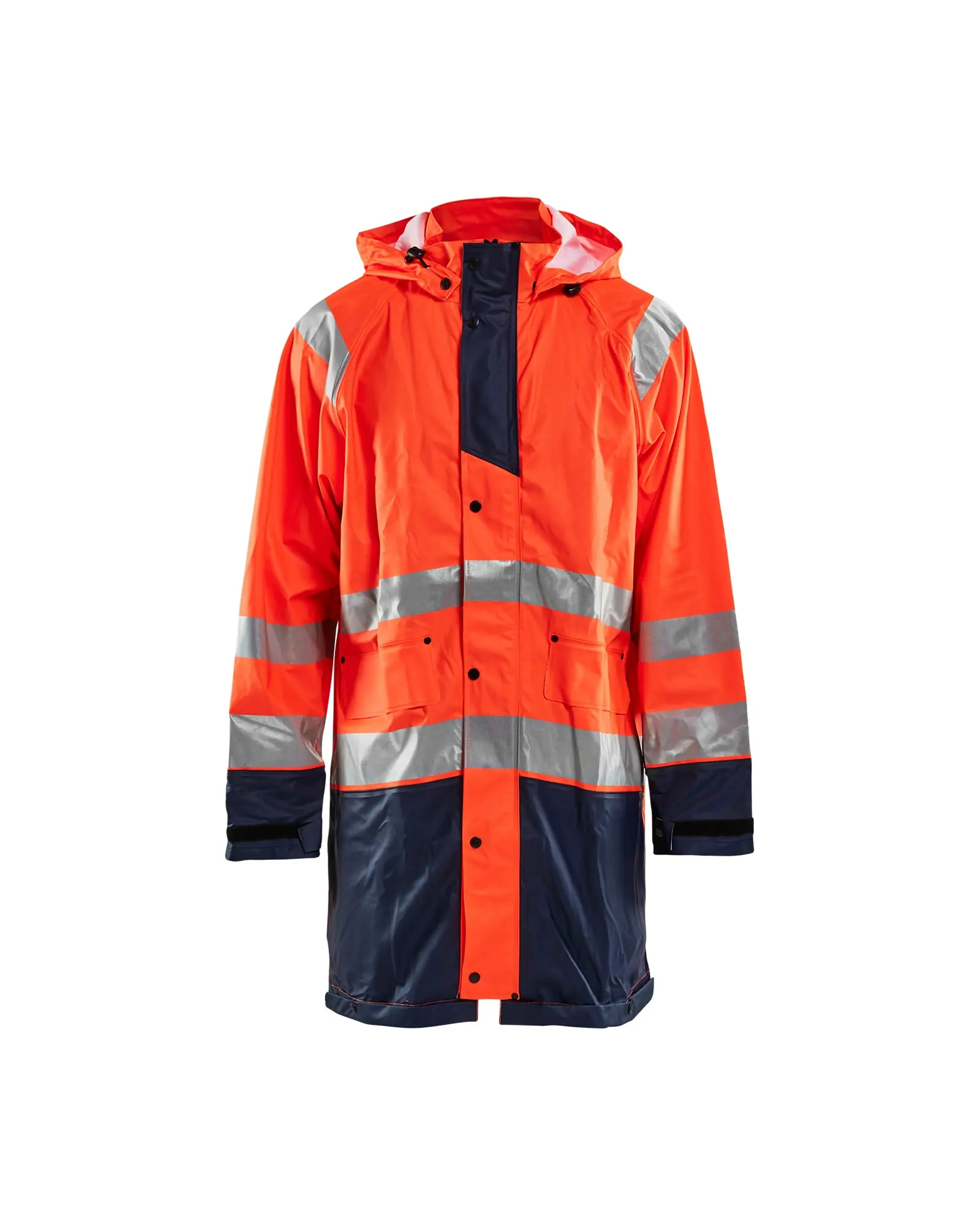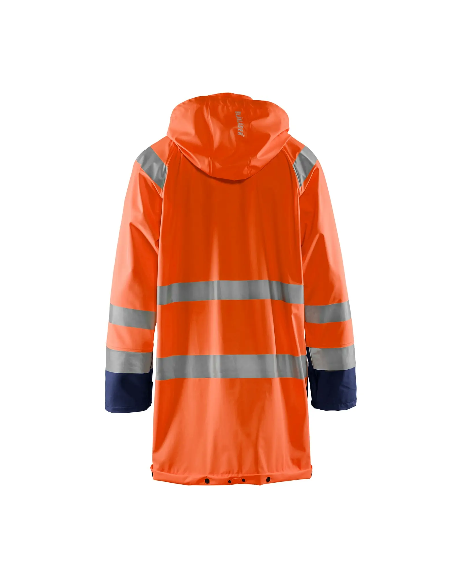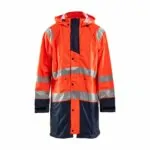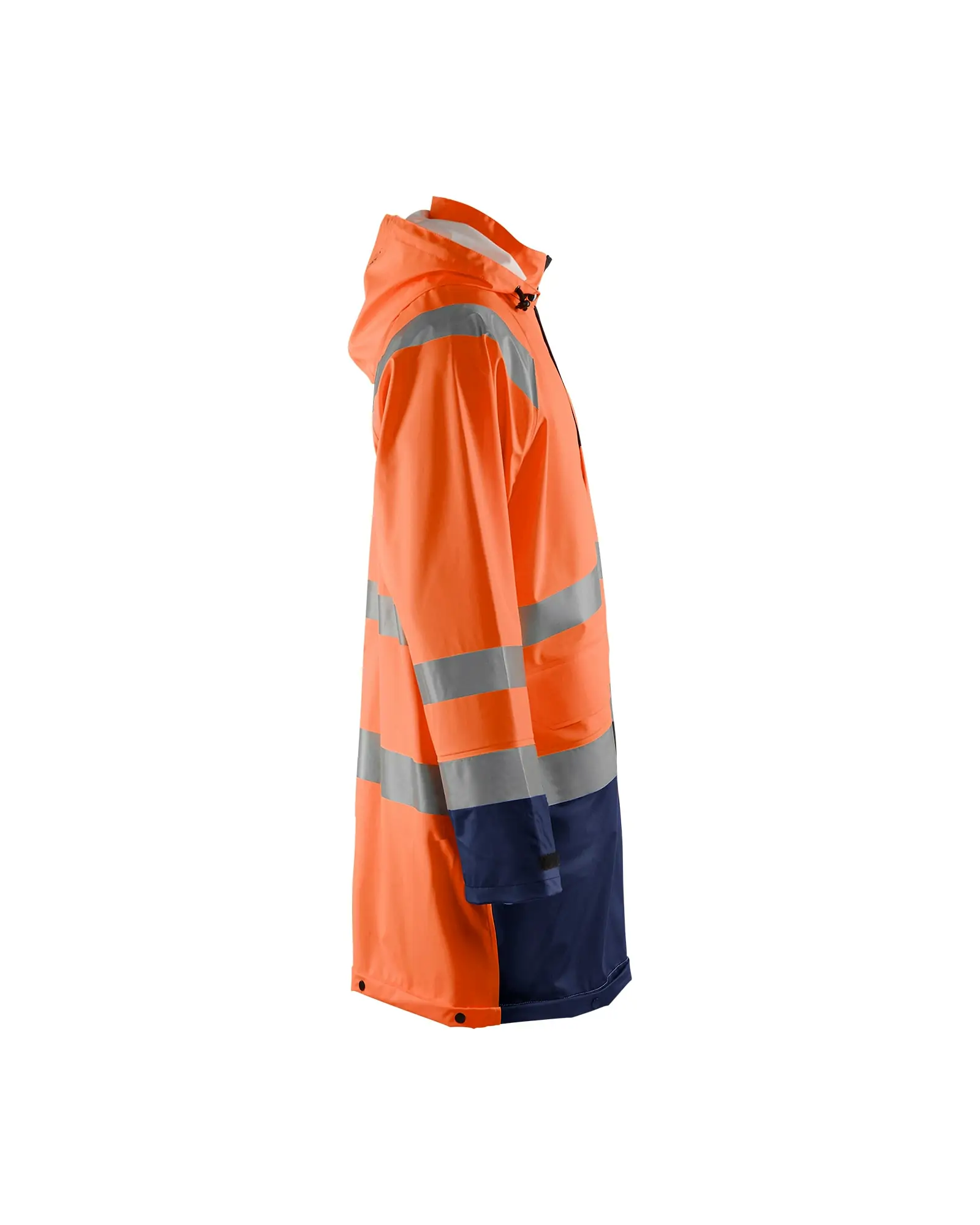 Blåkläder 4324 2000 highvis sadetakki, TASO 1. Sadetakki huomiovärillä työtehtäviin, jotka vaativat kevyttä ja pehmeää sadevaatetta. Tuulen- ja vedenpitävä, hengittävä materiaali, liimatut saumat. Huppu on irrotettava ja säädettävä. Takissa on kaksisuuntainen ylös kaulukseen asti ylettyvä vetoketju listan alla. Hyvä istuvuus tarralla säädettävillä hihansuilla. Helppokäyttöiset läpälliset etutaskut ja alahelmassa napitettava vesiura, josta vesi valuu pois takaa.
