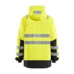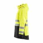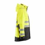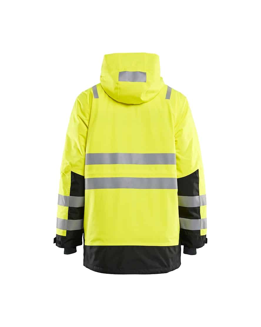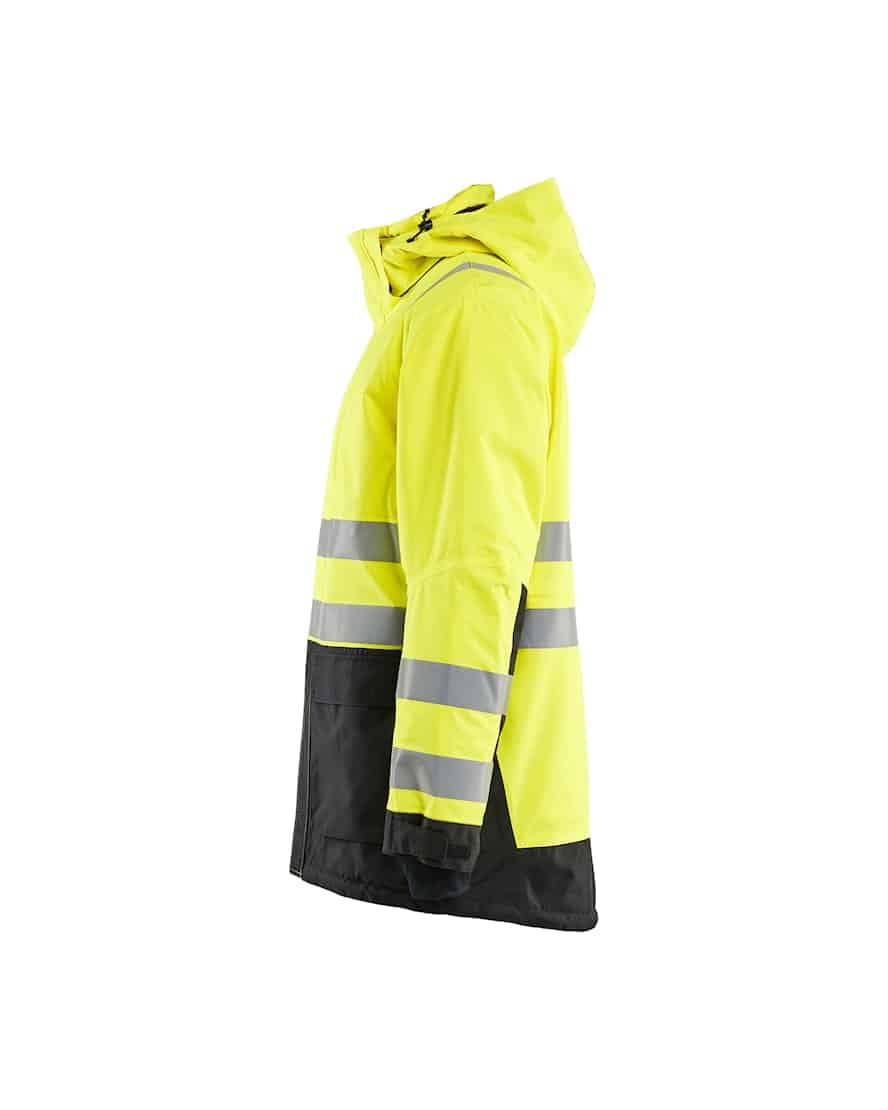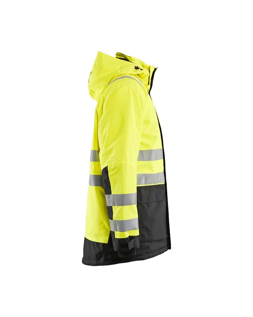 Blåkläder 4495 1987 highvis talviparka. Lämmin talviparka työpaikoille, joissa on tärkeää näkyä hyvin. Takissa on lämmin tikkivuori, kestävä tuulen- ja vedenpitävä kangas teipatuilla saumoilla. Tumma kangas sijoitettu herkimmin likaantuville alueille. Kaksisuuntainen vetoketju ja muotoillut hihat mukavuuden lisäämiseksi. Vyötärö säädettävissä kiristysnauhalla. Heijastimet on kiinnitetty painamalla, jotta ne mukailevat liikkeitä paremmin. Huppu on helppo irrottaa neppareilla.