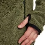 Kiinteä huppu. Yksisuuntainen muovinen vetoketju, fleecelista sisäpuolella. Rintatasku, jossa vetoketju. Vetoketjulliset sivutaskut. Takaa pidennetty helma, kuminauha alareunassa. Hihansuissa joustava resori, jossa peukalon aukot.