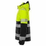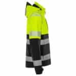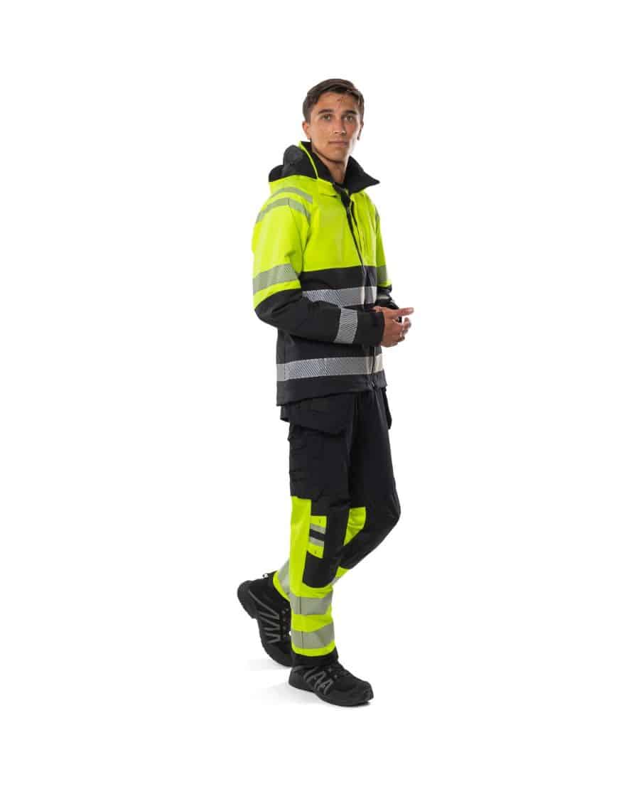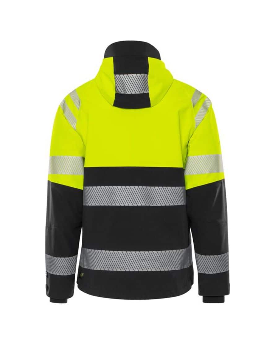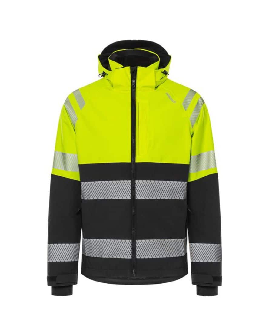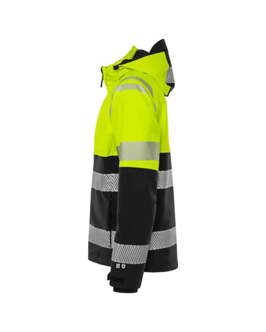 Osittain kierrätetty materiaali. 4-suuntaan joustava ripstop-materiaali. Veden- ja tuulenpitävä, hengittävä. Teipatut saumat. Irrotettava ja säädettävä huppu vahvistetulla huipulla. Fleecevuorattu kaulus. Täyspitkä vettä hylkivä etuketju sisälistalla. Rintatasku piilotetulla pystyketjulla, taskun sisällä lenkki ID-korttitaskun pidikkeelle. Vetoketjulliset etutaskut. Vetoketjullinen povitasku. Muotoillut hihat. Säädettävät hihansuut. Peukaloaukolliset sisäresorit hihansuissa. Säädettävä nyöri vyötäröllä. Pidennetty selkä. Vetoketju vuorissa siirtokuvia varten. Vesipilariarvo 10.000 mm. RET <15 / Hyväksytty standardien EN ISO 20471 lk 1 ja EN 343 lk 4/4 mukaan. Hyväksynnät 20 pesukerran jälkeen. ÖKO-TEX® -sertifioitu.