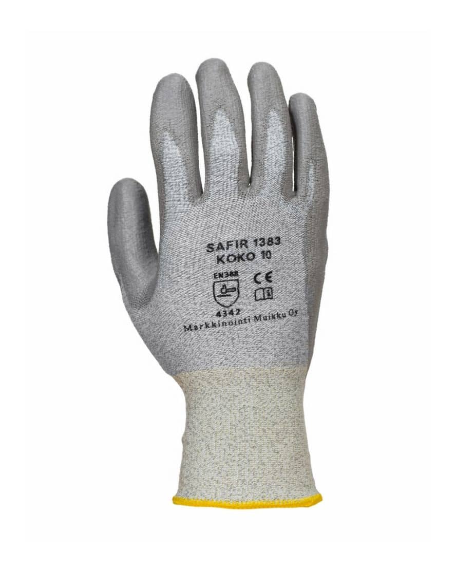 JM 1383 Safir 3 viiltosuojakäsine. Erittäin hyvä istuvuus. Viiltosuojaluokka 3. Pu -pinnoitettu kämmen osa. EN 388 – Cat.2.
