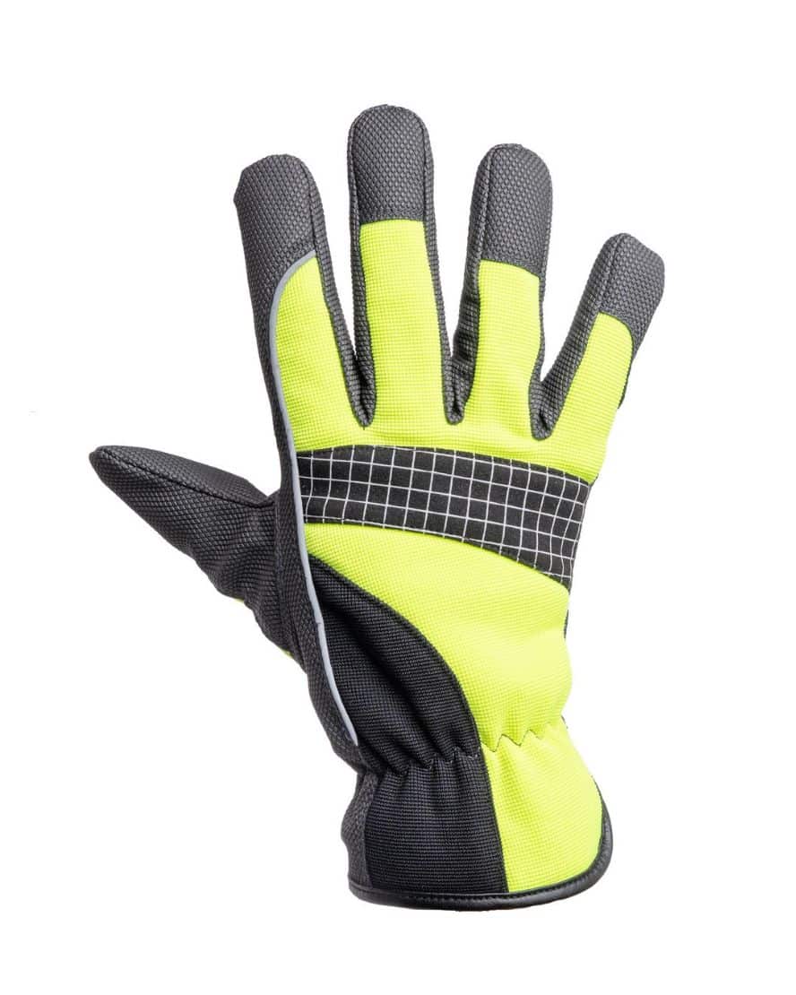Kämmen kestävää pu-pinnoitettua ja joustavaa keinonahkaa. Selkämys spandexia. Heijastintere. EN 420.