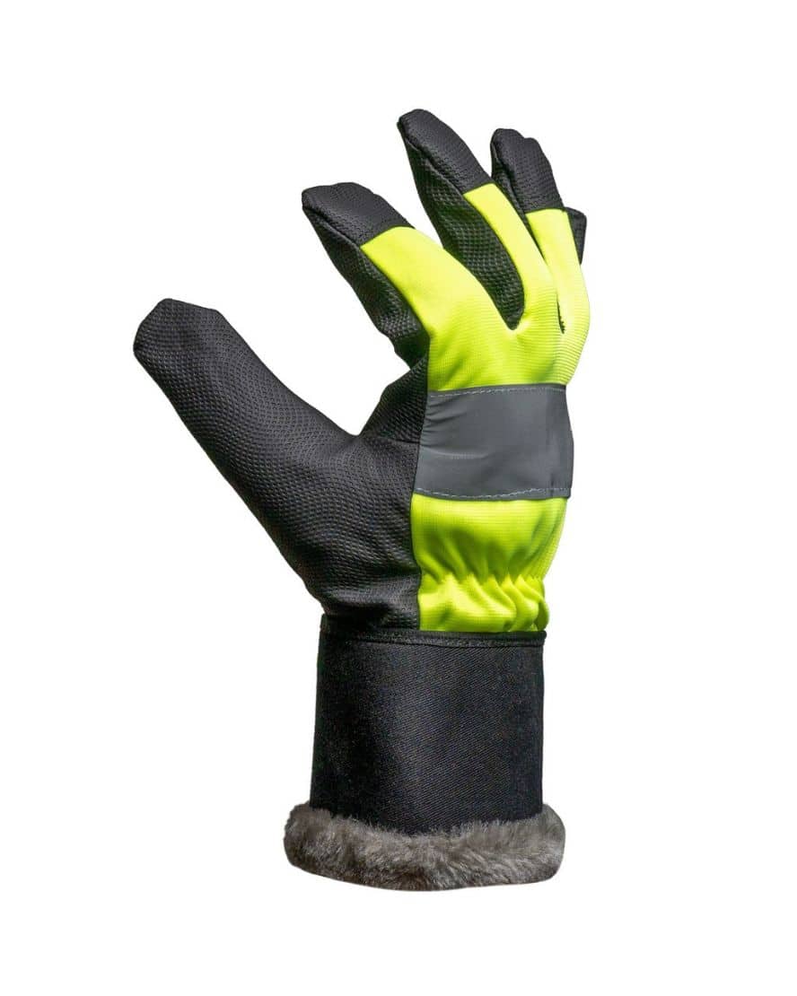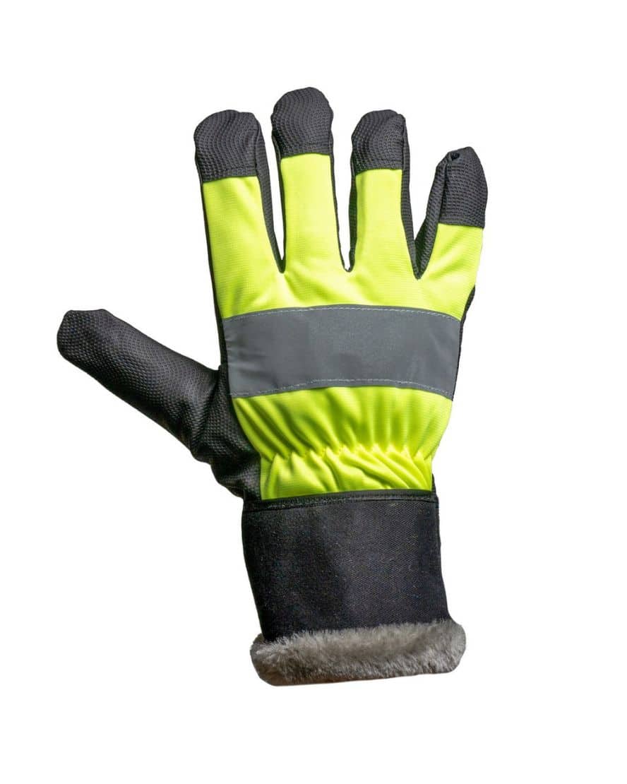 Selkämys huomioväri keltaista polyesteriä. Heijastin selkämyksessä. Etusormissa kosketusnäyttö ominaisuus. Kova ranneke. EN 420.