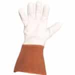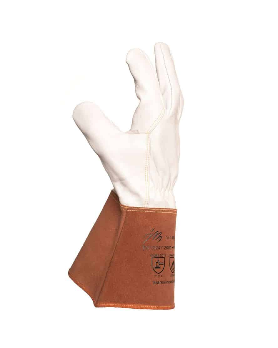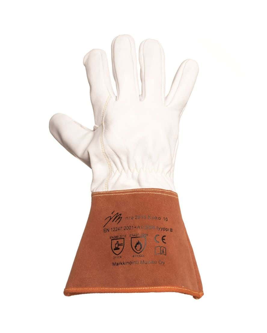 JM 2615 tig hitsauskäsine. EN 12247:2001 + A1:2005 tyyppi B. EN 388:2016. EN 407:2004. Teresuojattu. Kevlarlangalla ommeltu. Korkea ranneke. Cat.2.