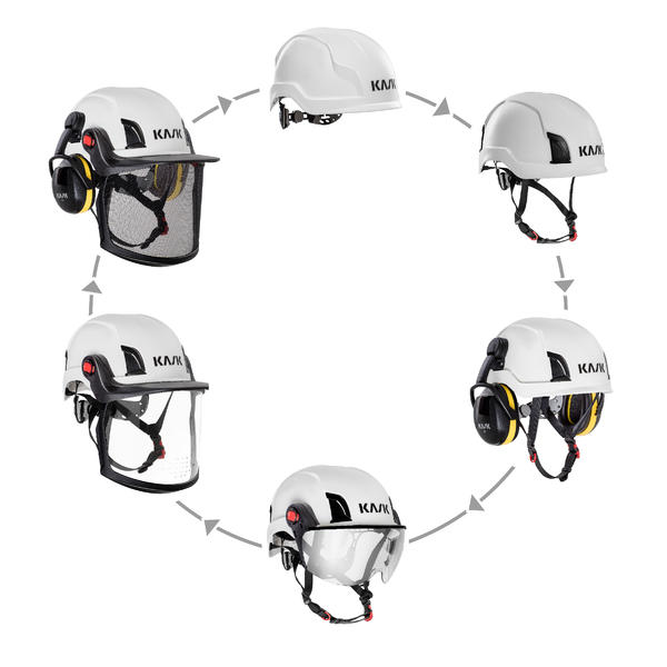 Kaksi asentoa: Nostettuna kypärän päälle kuljetusasentoon sekä laskettuna alas silmien eteen työasentoon. Yläreunassa kumireunus ehkäisee vesipisaroiden valumista kasvoille, ja alareunuksen pyöreä viimeistely tekee käytöstä miellyttävää ja ihoturvallista.