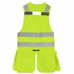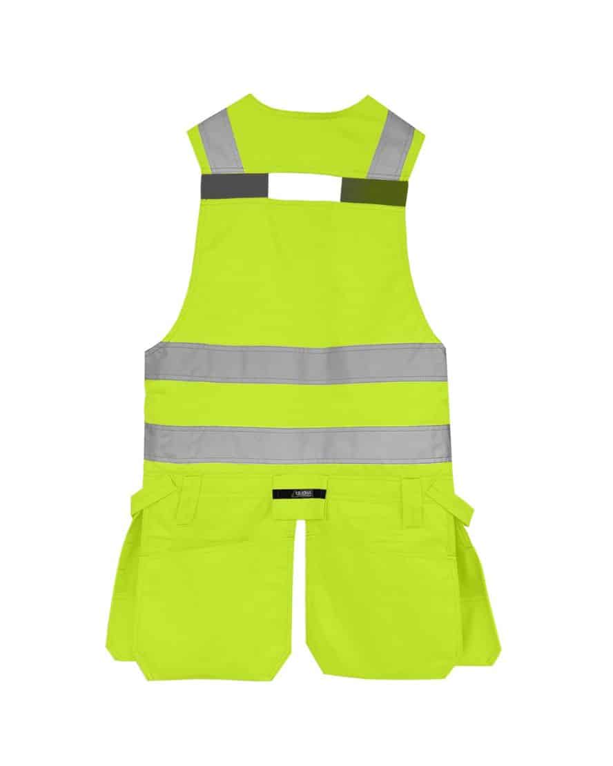 Edessä vetoketju piilossa ja levityspala sisäpuolella, riippuvat rintataskut, rintataskujen alla tarrakiinnitys, vasemman rintataskun päällä erillinen kynätasku sekä työkalulenkki, nappi ja lenkki puukolle, oikean rintataskun päällä puhelintasku, henkilökorttitasku (pysty- /vaakakortille), rintataskujen alapuolella riippuvat poranterätaskut, kaksi riippuvaa työkalutaskua etuvyötäröllä, eturiipputaskuissa vahvistetut pohjat ja 3-lokeroinen lisätasku päällä, kaksi riippuvaa työkalutaskua takavyötäröllä, takariipputaskuissa vahvistetut pohjat, vyölenkit, vasaralenkit, selässä joustoa (kuminauhoin) ja aukko valjaille Standardit: Näkyvä EN ISO 20471 luokka 2 (koot C50-64) / luokka 1 (koot C44-48).