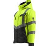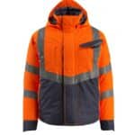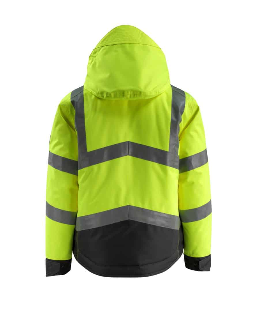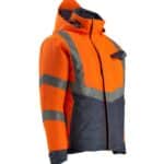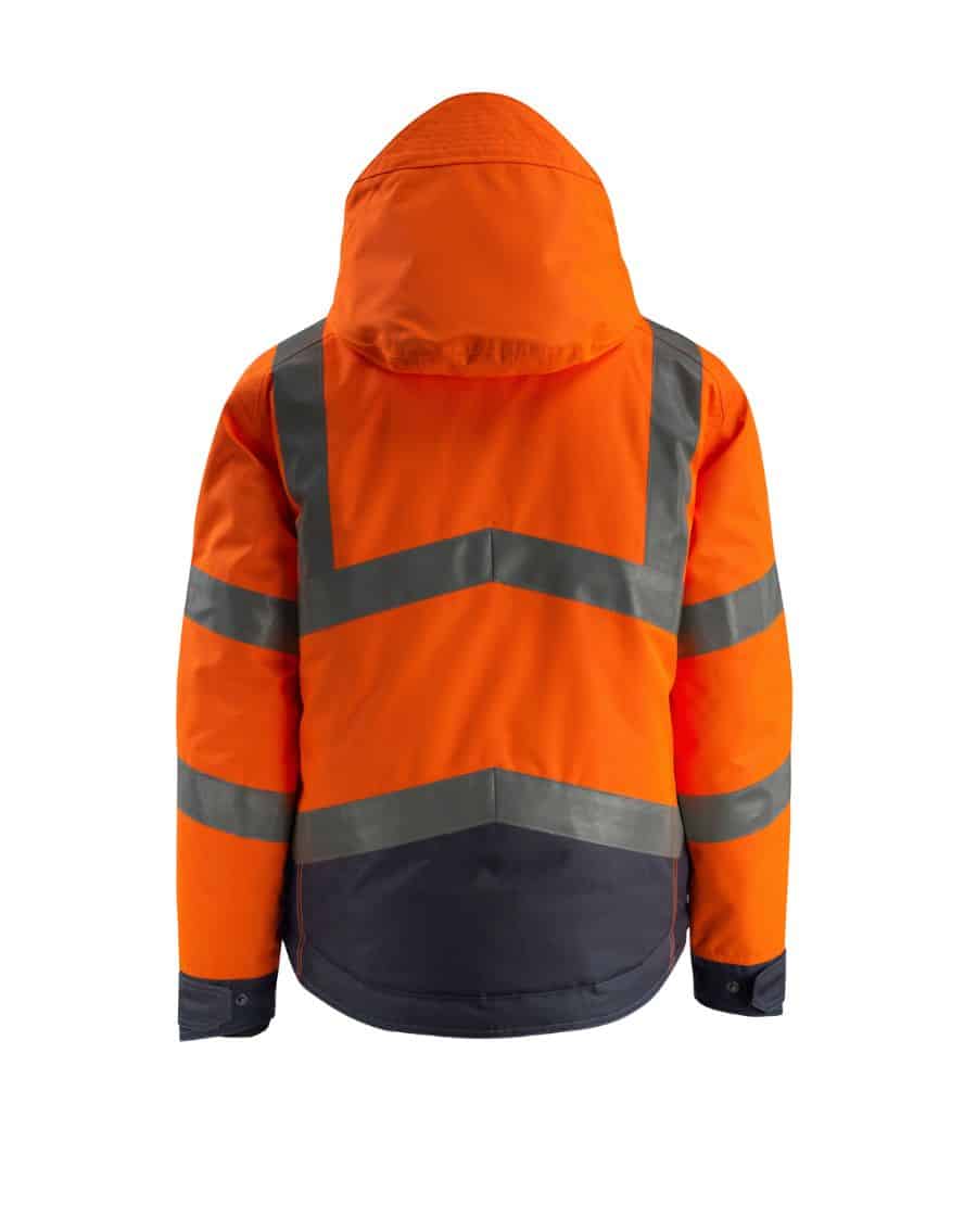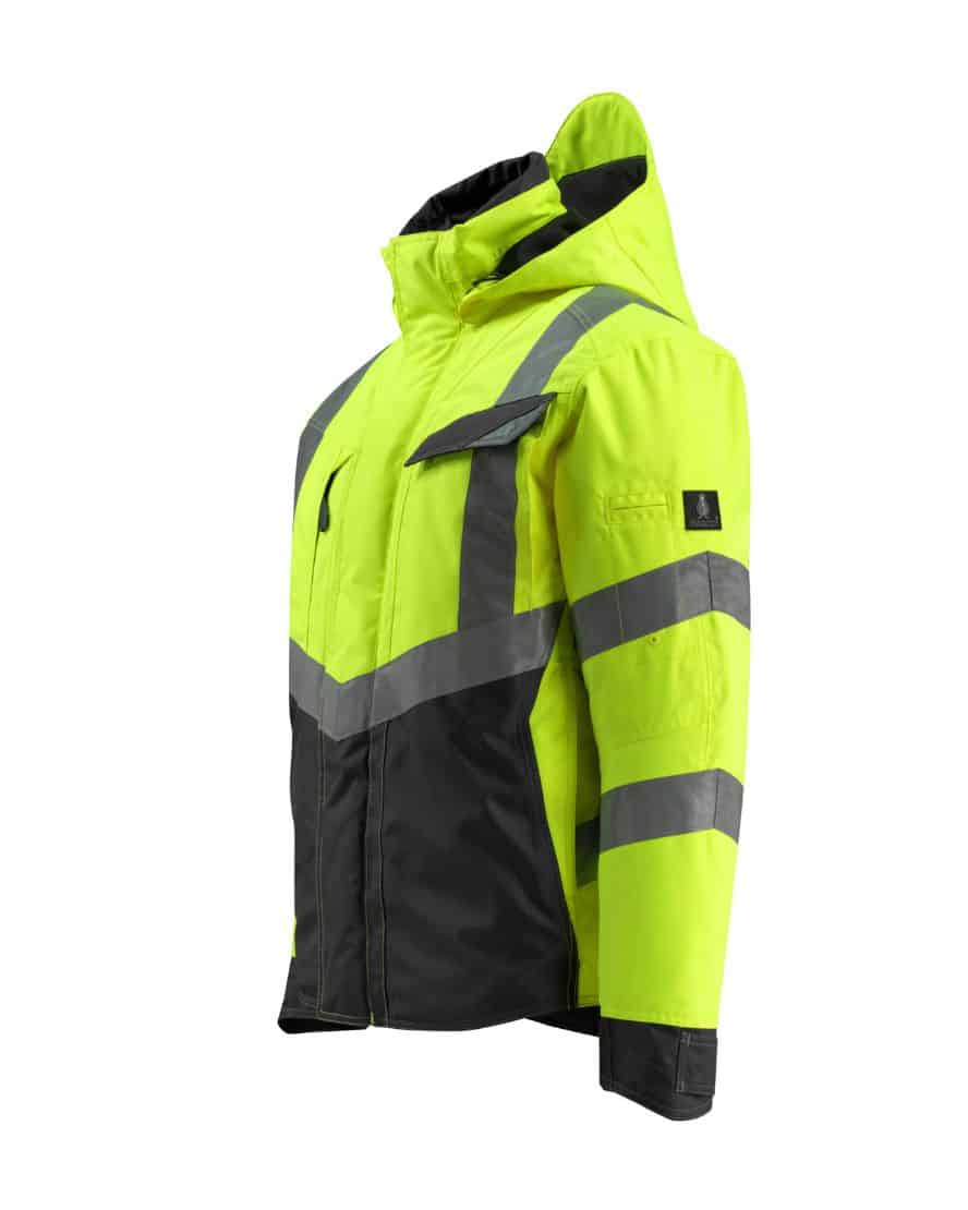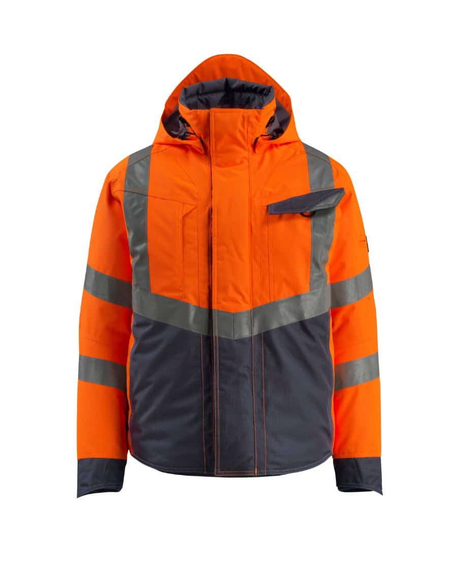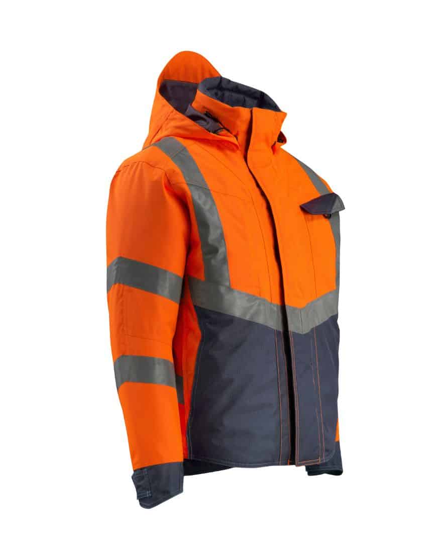 Mascot 15535-231 SAFE SUPREME talvitakki. Fluoresoiva, pysty- ja vinoheijastimet. Kaksivärinen. Hengittävä, tuulen- ja vedenpitävä. Teipatut saumat. Topattu. Tikkivuori hihoissa. Korkea kaulus. Sisäkaulus ribbineulosta. Irrotettava, vuorattu huppu, jonka voi säätää kypärän päälle sopivaksi säätönarulla.