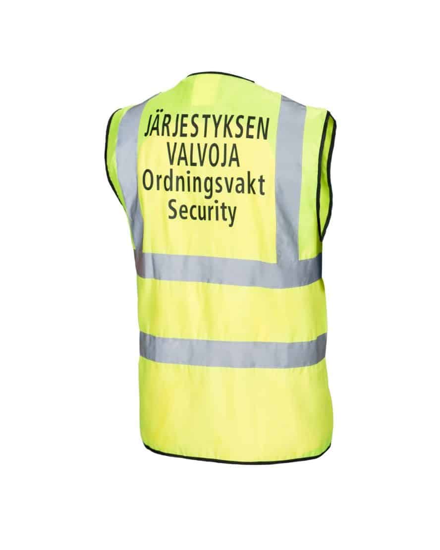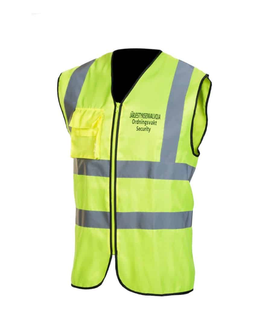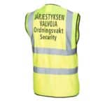Priha 4018 järjestysmiesliivi, 5kpl. Tekstit oikealla rinnassa ja selässä: suomi, ruotsi ja englanti. Materiaali: 100% polyesteriä.