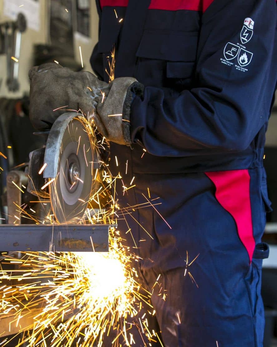 EN ISO 11611:2007 Luokka lAl – EN 1149-5 – EN ISO 11612 Al+A2, Bl, Cl, El – oheisten standardien mukainen staattista sähköä johtava suojavaate hitsaukseen ja vastaaviin töihin suojaamaan kuumuudelta ja tulelta – 8 taskua mm. kännykkätasku, mittataskut työkalulenkit sekä kipinöiltä suojaavat taskunläpät – nappi/nepparikiinnitys – polvisuojataskut – hihansuissa tarrasäätö – joustovyötärö.