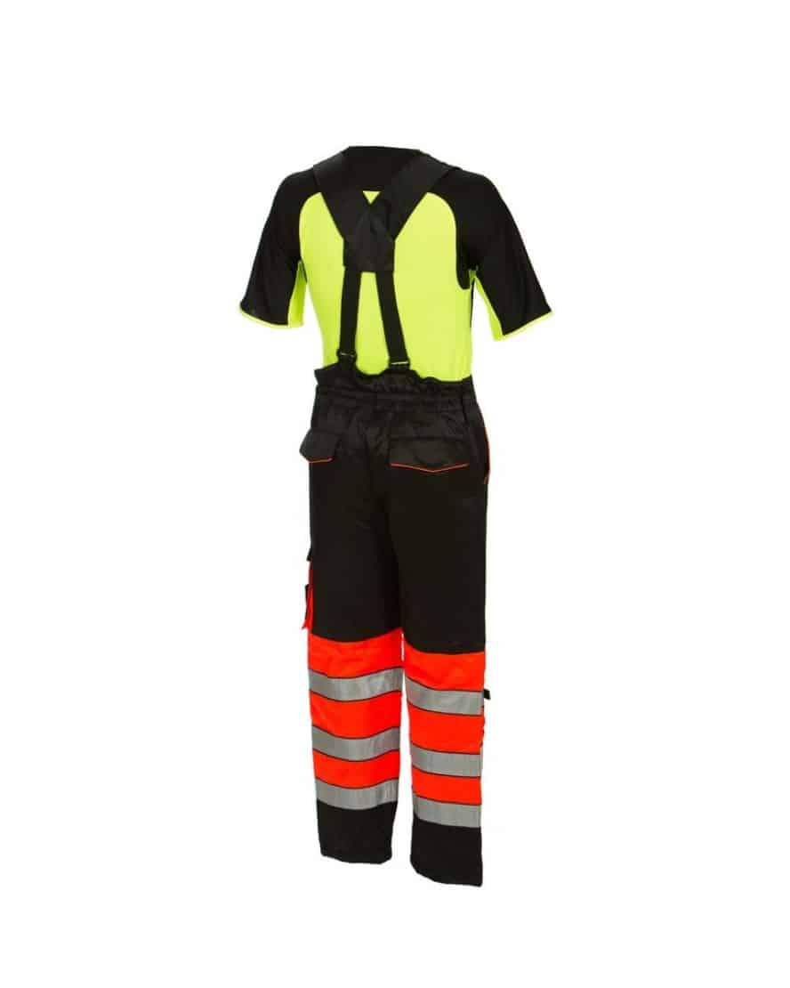 Irrotettavilla jousto-olkaimilla. 6 taskua mm. vetoketjullinen reisitasku, irrotettava henkilökorttitasku sivutaskut ja läpälliset takataskut korotettu takavyötärö. Sivusta ladattavat polvisuojataskut. Leveät vyölenkit. Heijastimien suojatereet.