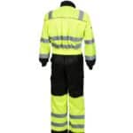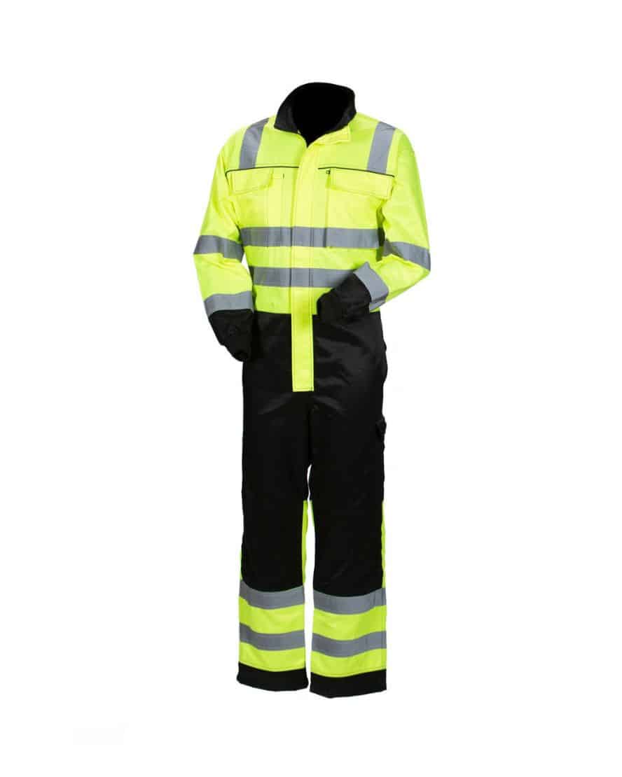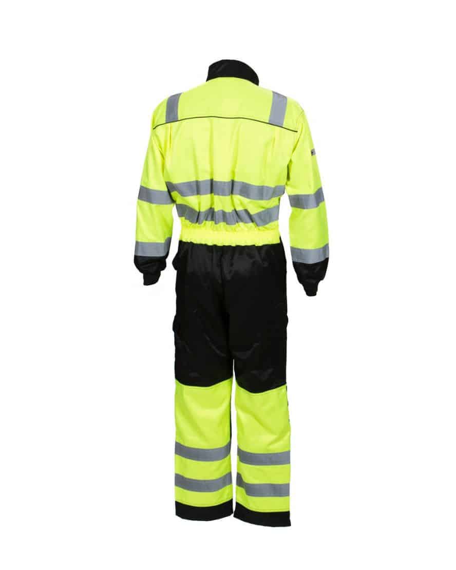 EN 20471:2013 Lk.3 – 9 taskua mm. läpälliset rintataskut, joissa toisessa vetoketju, kynätasku, mittatasku, vasaralenkki, sivutaskut, joista pääsy sisätaskuille – vetoketjullinen reisitasku – polvisuojataskut – edessä kaksisuuntainen vetoketju suojalistalla – selkäosassa tilaa antava leikkaus/laskos – vyötärönkiristys takaosassa.
