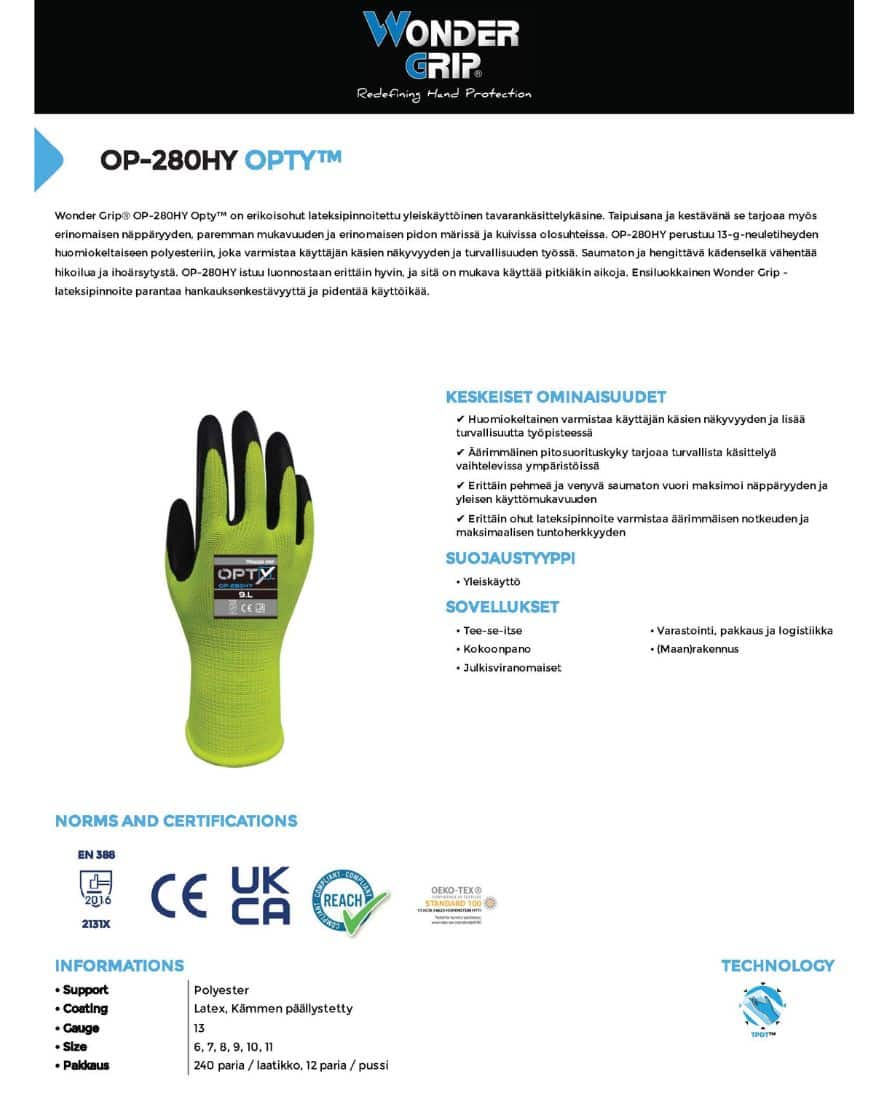 Wonder Grip 280 robust grip suojakäsine. Wonder Grip® OP-280HY Opty™ on erikoisohut lateksipinnoitettu yleiskäyttöinen tavarankäsittelykäsine. Taipuisana ja kestävänä se tarjoaa myös erinomaisen näppäryyden, paremman mukavuuden ja erinomaisen pidon märissä ja kuivissa olosuhteissa. OP-280HY perustuu 13-g-neuletiheyden huomiokeltaiseen polyesteriin, joka varmistaa käyttäjän käsien näkyvyyden ja turvallisuuden työssä. Saumaton ja hengittävä kädenselkä vähentää hikoilua ja ihoärsytystä. OP-280HY istuu luonnostaan erittäin hyvin, ja sitä on mukava käyttää pitkiäkin aikoja. Ensiluokkainen Wonder Grip -lateksipinnoite parantaa hankauksenkestävyyttä ja pidentää käyttöikää.