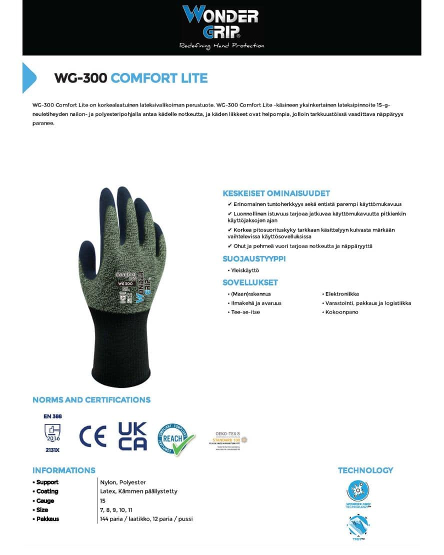 Wonder Grip 300 comfort lite suojakäsine. Erittäin ohut ja joustava. 15 gaugen paksuus. Hengittävä selkämys.