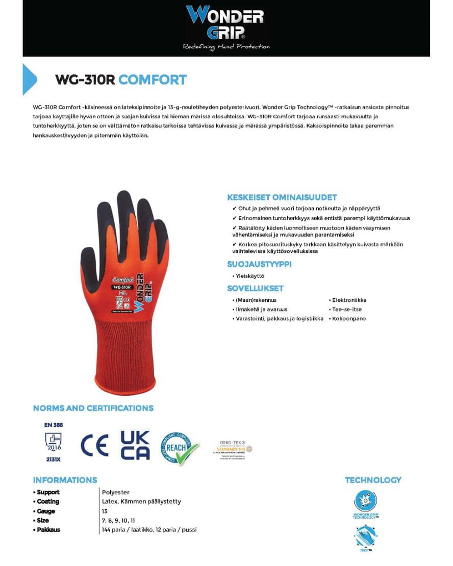 Wonder Grip 310 Comfort suojakäsine. WG-310R Comfort -käsineessä on lateksipinnoite ja 13-g-neuletiheyden polyesterivuori. Wonder Grip Technology™ -ratkaisun ansiosta pinnoitus tarjoaa käyttäjille hyvän otteen ja suojan kuivissa tai hieman märissä olosuhteissa. WG-310R Comfort tarjoaa runsaasti mukavuutta ja tuntoherkkyyttä, joten se on välttämätön ratkaisu tarkoissa tehtävissä kuivassa ja märässä ympäristössä. Kaksoispinnoite takaa paremman hankauskestävyyden ja pitemmän käyttöiän.