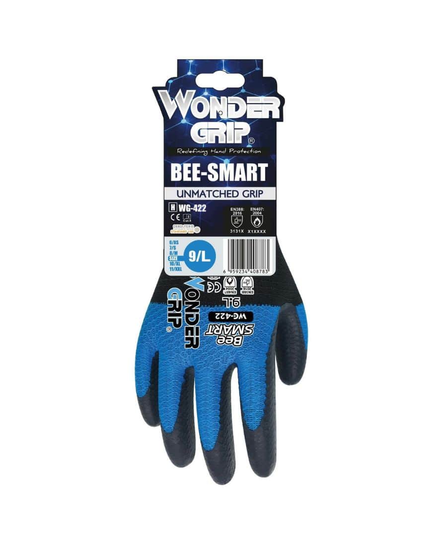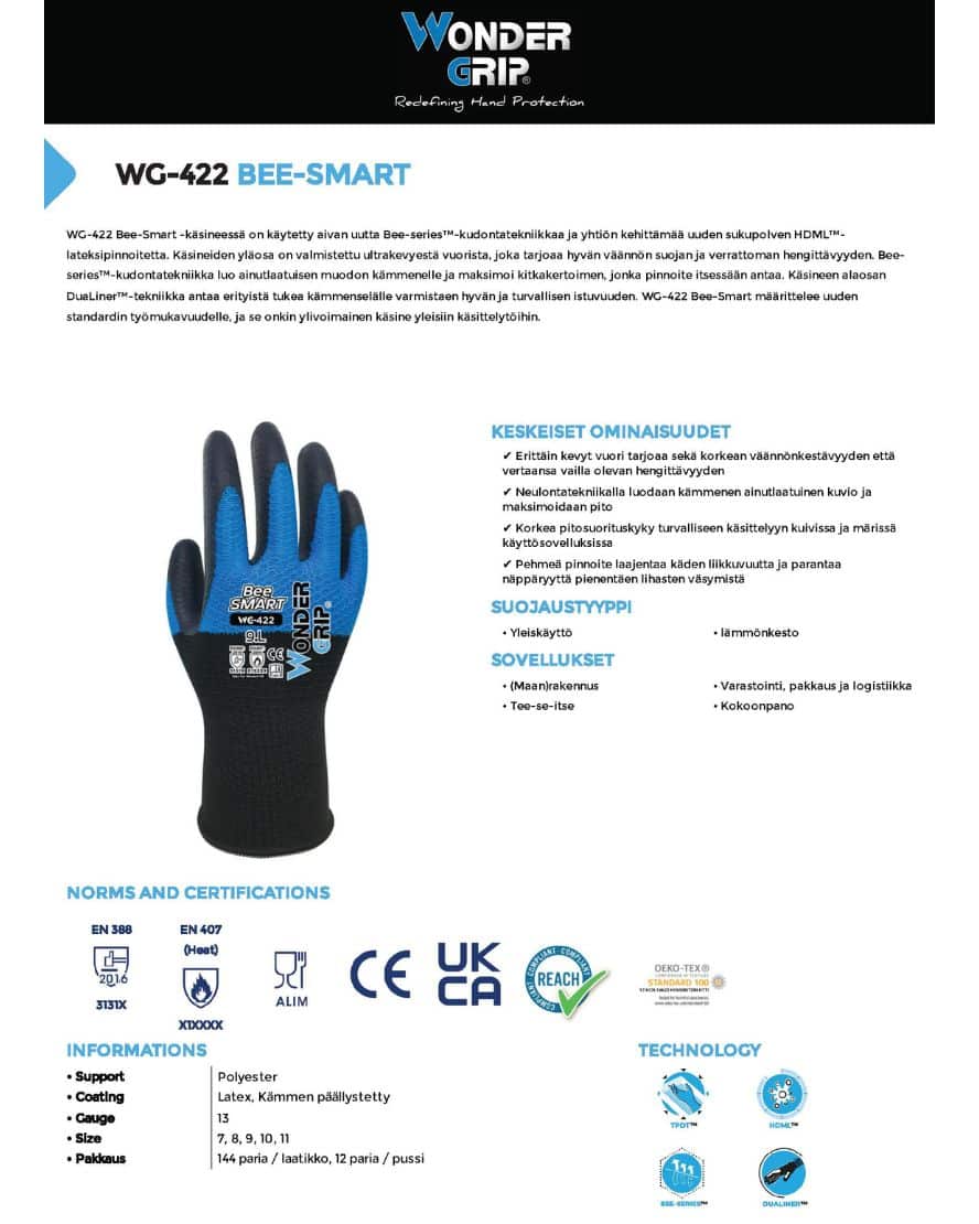 Wonder Grip 422 bee-smart suojakäsine. WG-422 Bee-Smart -käsineessä on käytetty aivan uutta Bee-series™-kudontatekniikkaa ja yhtiön kehittämää uuden sukupolven HDML™-lateksipinnoitetta. Käsineiden yläosa on valmistettu ultrakevyestä vuorista, joka tarjoaa hyvän väännön suojan ja verrattoman hengittävyyden. Bee-series™-kudontatekniikka luo ainutlaatuisen muodon kämmenelle ja maksimoi kitkakertoimen, jonka pinnoite itsessään antaa. Käsineen alaosan DuaLiner™-tekniikka antaa erityistä tukea kämmenselälle varmistaen hyvän ja turvallisen istuvuuden. WG-422 Bee-Smart määrittelee uuden standardin työmukavuudelle, ja se onkin ylivoimainen käsine yleisiin käsittelytöihin.