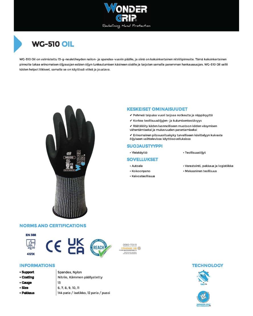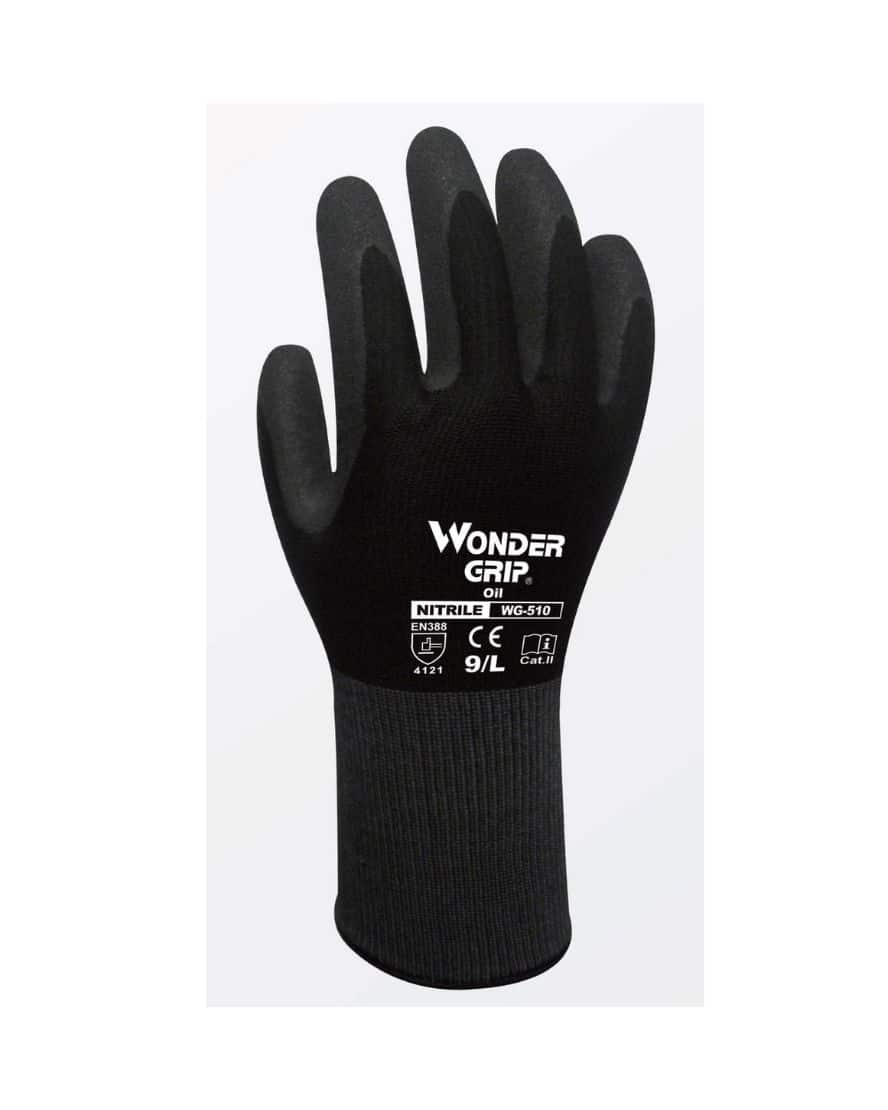 Wonder Grip 510 oil suojakäsine. WG-510 Oil on valmistettu 13-g-neuletiheyden nailon- ja spandex-vuorin päälle, ja siinä on kaksinkertainen nitriilipinnoite. Tämä kaksinkertainen pinnoite takaa erinomaisen öljysuojan estäen öljyn tunkeutumisen käsineen sisälle ja tarjoten samalla paremman hankaussuojan. WG-510 Oil sallii käden helpot liikkeet, samalla se on käytössä viileä ja joustava.