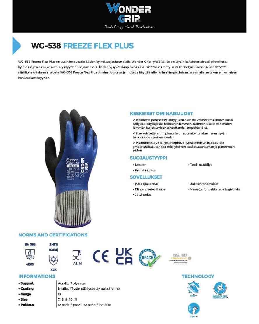 Wonder Grip 538 freeze flex plus talvikäsine. WG-538 Freeze Flex Plus on uusin innovaatio käsien kylmäsuojauksen alalla Wonder Grip -yhtiöltä. Se on täysin kaksinkertaisesti pinnoitettu kylmäsuojakäsine (kosketuskylmyyden suojaustaso 2: kädet pysyvät lämpiminä aina -20 °C asti). Erityisesti kehitetyn innovatiivisen STNT™-nitriilipinnoituksen ansiosta WG-538 Freeze Flex Plus on aina joustava ja mukava käyttää alle nollan lämpötiloissa, ja samalla se takaa erinomaisen hankauskestävyyden.