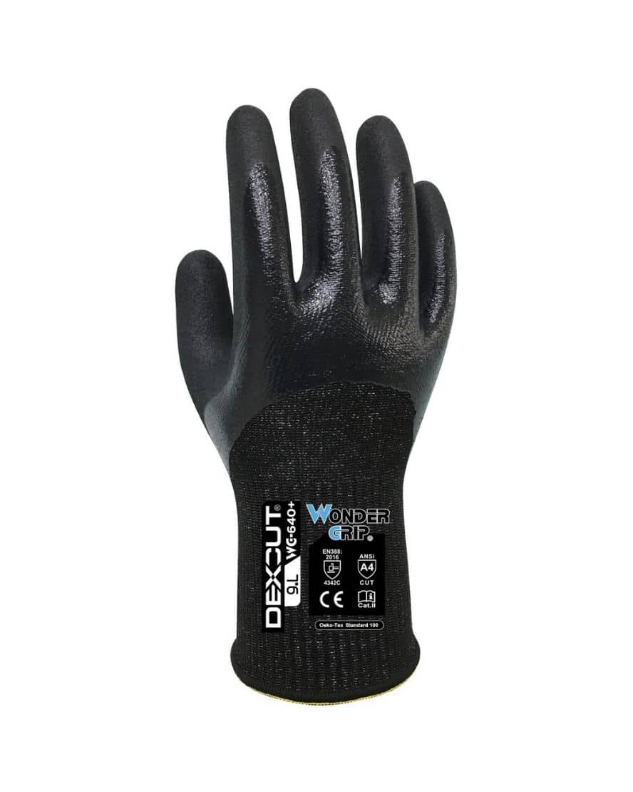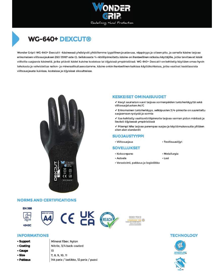 Wonder Grip 640+ dexcut 3/C viiltosuojakäsine. Wonder Grip® WG-640+ Dexcut® -käsineessä yhdistyvät joustavuus, näppäryys ja otteen pito, ja samalla käsine tarjoaa erinomaisen viiltosuojauksen (ISO 13997 luokka 3/C). Selkäosasta ¾-nitriilipinnoitettu käsine on ihanteellinen ratkaisu käyttäjille, jotka tarvitsevat viilloilta suojaavia käsineitä, jotka pitävät kädet kuivina kosteissa tai öljyisissä ympäristöissä. WG-640+ Dexcut® on kehitetty käyttäen omaa hyvin tehokasta ja vahvistettua nailon- ja mineraalikuituseostamme, käsine onkin ihanteellinen kaikissa käyttökohteissa, jotka vaativat keskitasoista viiltosuojausta kuivissa, kosteissa ja öljyisissä olosuhteissa.