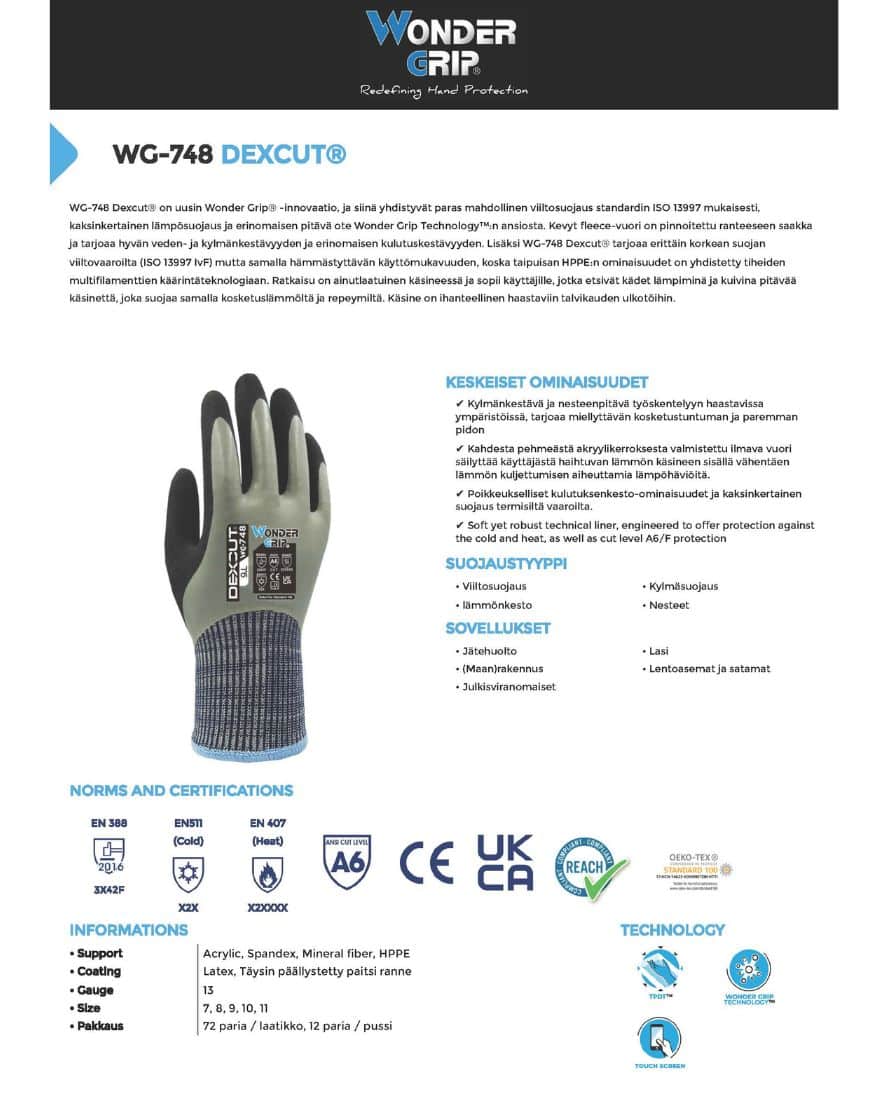 WG-748 Dexcut® on uusin Wonder Grip® -innovaatio, ja siinä yhdistyvät paras mahdollinen viiltosuojaus (F/A6) standardin ISO 13997 mukaisesti, kaksinkertainen lämpösuojaus ja erinomaisen pitävä ote Wonder Grip Technology™:n ansiosta. Kevyt fleece-vuori on pinnoitettu ranteeseen saakka ja tarjoaa hyvän veden- ja kylmänkestävyyden ja erinomaisen kulutuskestävyyden. Lisäksi WG-748 Dexcut® tarjoaa erittäin korkean suojan viiltovaaroilta (ISO 13997 F/A6) mutta samalla hämmästyttävän käyttömukavuuden, koska taipuisan HPPE:n ominaisuudet on yhdistetty tiheiden multifilamenttien ompeluteknologiaan. Ratkaisu on ainutlaatuinen käsineessä ja sopii käyttäjille, jotka etsivät kädet lämpiminä ja kuivina pitävää käsinettä, joka suojaa samalla kosketuslämmöltä ja repeämiltä. Käsine on ihanteellinen haastaviin talvikauden ulkotöihin. Poikkeukselliset kulutuksenkesto-ominaisuudet ja kaksinkertainen suojaus termisiltä vaaroilta. Kaikissa sormissa kosketusnäyttö ominaisuus.