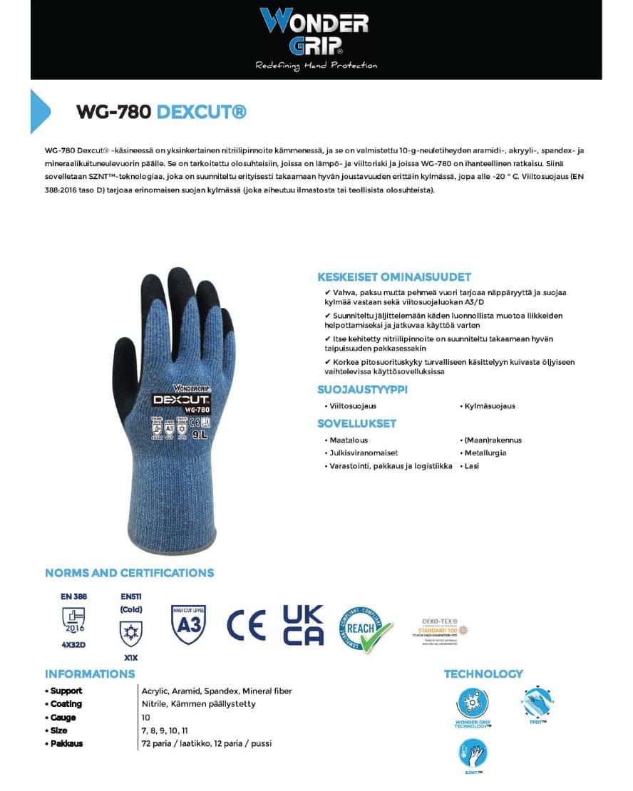 Wonder Grip 780 dexcut D winter viiltosuojakäsine. WG-780 Dexcut® -käsineessä on yksinkertainen nitriilipinnoite kämmenessä, ja se on valmistettu 10G-neuletiheyden aramidi-, akryyli-, spandex- ja mineraalikuituneulevuorin päälle. Se on tarkoitettu olosuhteisiin, joissa on lämpö- ja viiltoriski ja joissa WG-780 on ihanteellinen ratkaisu. Siinä sovelletaan SZNT™-teknologiaa, joka on suunniteltu erityisesti takaamaan hyvän joustavuuden erittäin kylmässä, jopa alle -20 ° C. Viiltosuojaus (EN 388:2016 taso D) tarjoaa erinomaisen suojan kylmässä (joka aiheutuu ilmastosta tai teollisista olosuhteista).